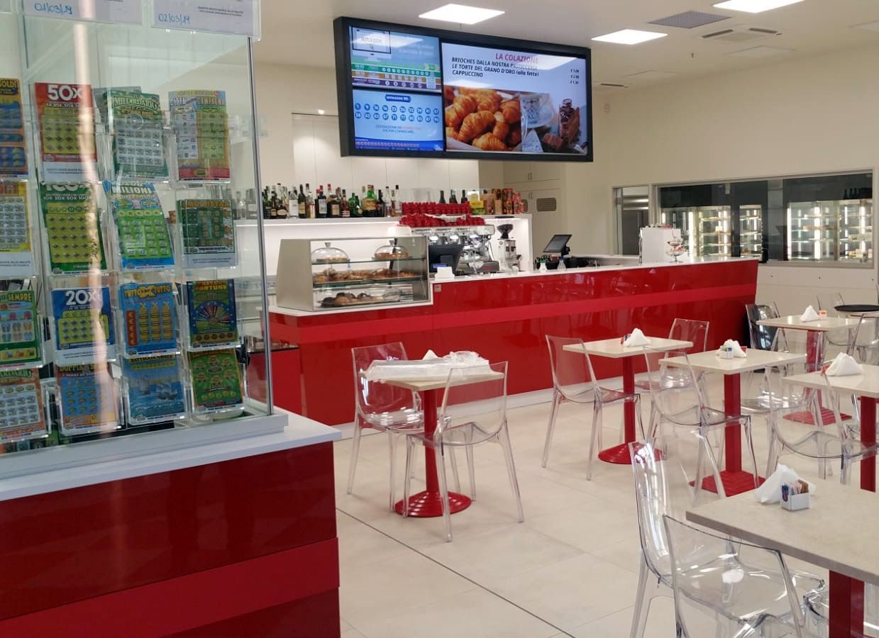 L’attività commerciale non passa inosservata grazie ai colori rosso Ferrari e il bianco latte scelti in fase di progetto. Il banco bar, interamente realizzato su misura da Ama Arredamenti, è stato progettato creando degli inserti in facciata laccati rosso lucido e bianco. All’interno del banco è presente un’ampia zona di celle refrigerate adibite allo stoccaggio della merce ed è stata creata un isola bifacciale che ne consente la comodità di utilizzo da parte