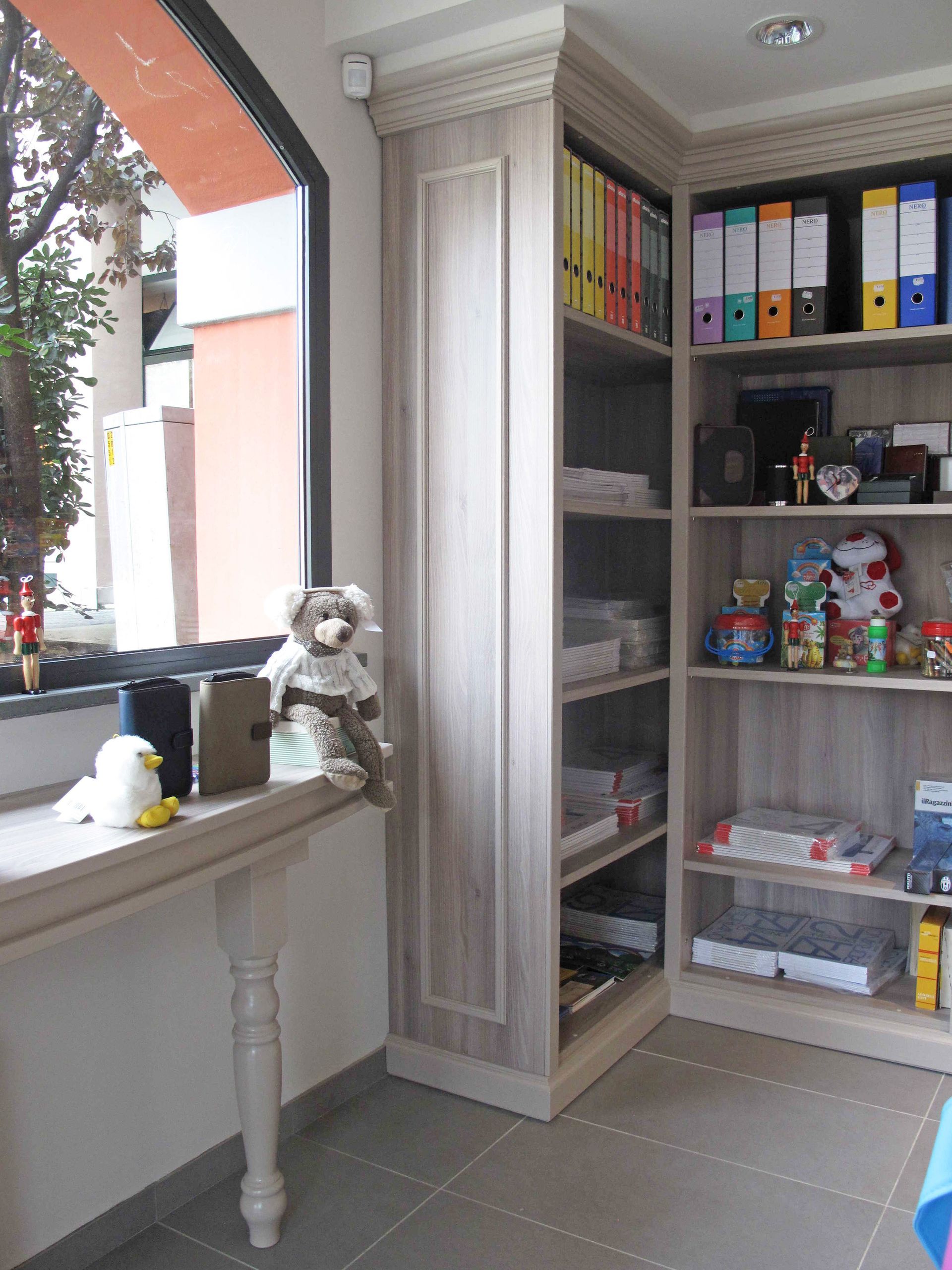 Il progetto prevede il bancone e le scaffalature su misura utilizzando laccature a campione. Tutto questo unendo l’estetica alla capienza e praticità, fondamentale in attività commerciali come la cartoleria.