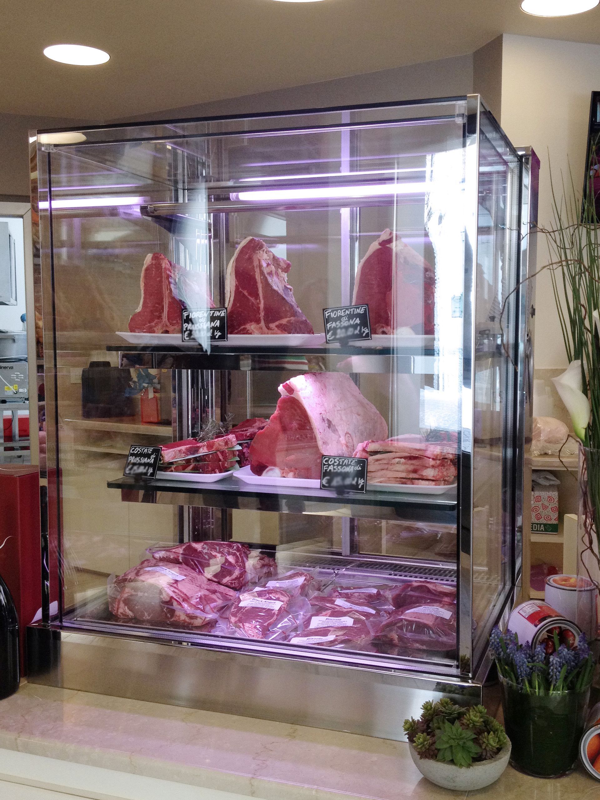 Il vetrinotto refrigerato, realizzato su misura, rappresenta un elemento particolare di questo arredamento. Collocato al fianco del banco vendita valorizza carni pregiate provenienti da tutto il mondo. Lo stile provenzale e i toni delicati delle nuances di colore, le lavorazioni del legno fanno di questo progetto un esempio di eleganza e raffinatezza.