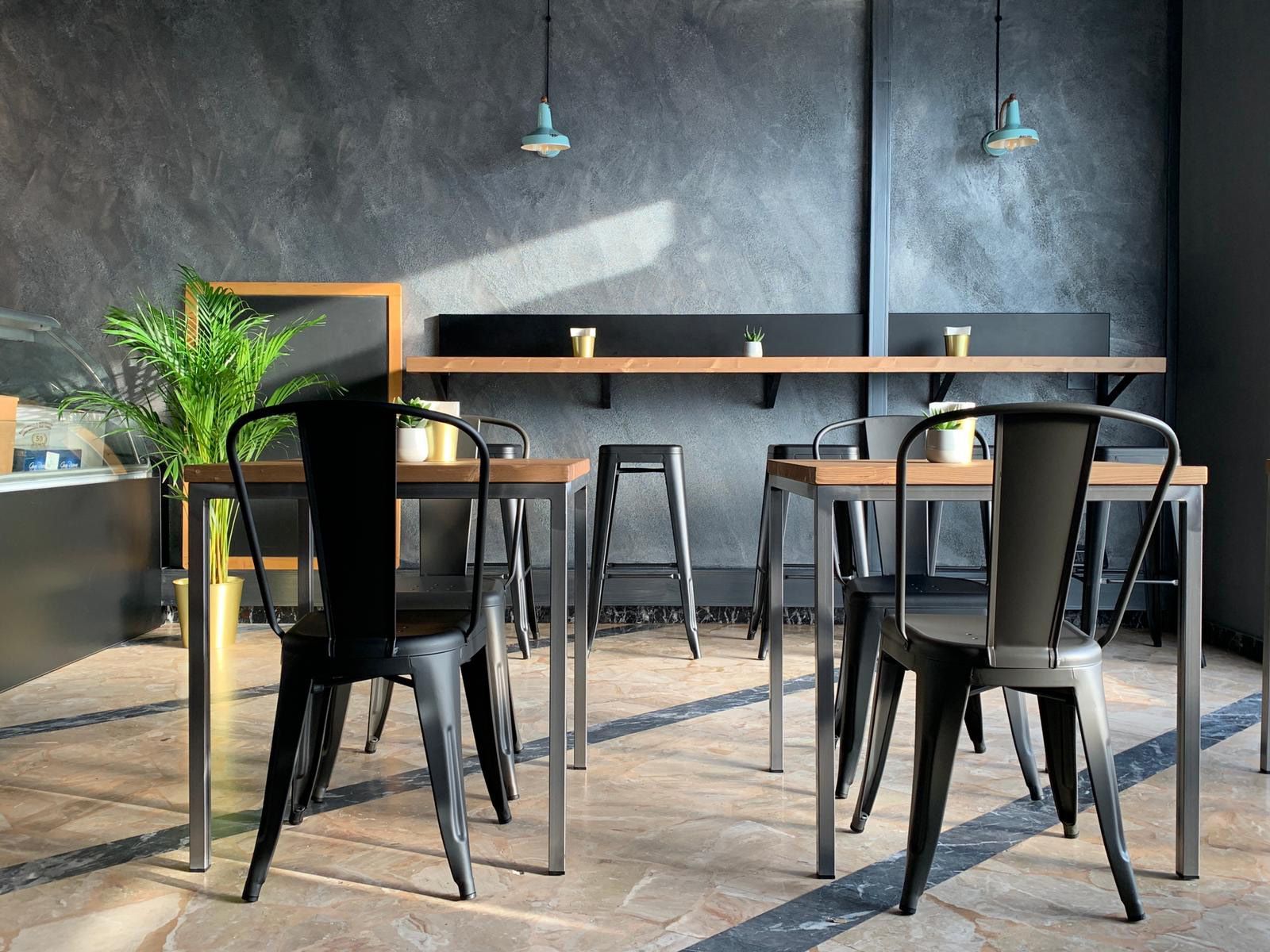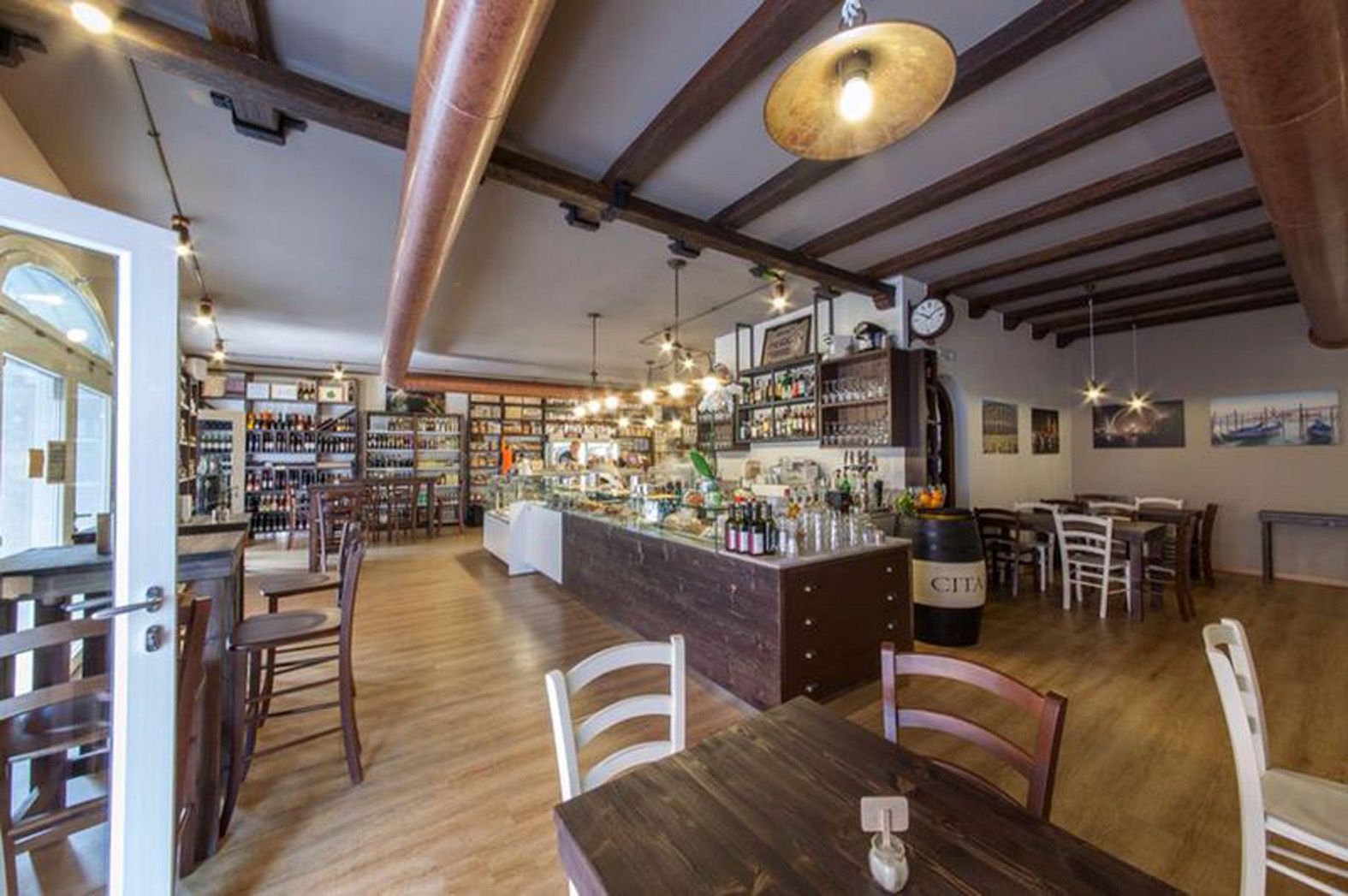 Enogastronomia e bistrot dal gusto industrial - ristrutturazione eseguita da Ama arredamenti conservando i pavimenti in cementina esistenti e altri elementi quali il portone d’ingresso secondario e la finestra sul fondo, che lascia intravedere un giardino ben curato.