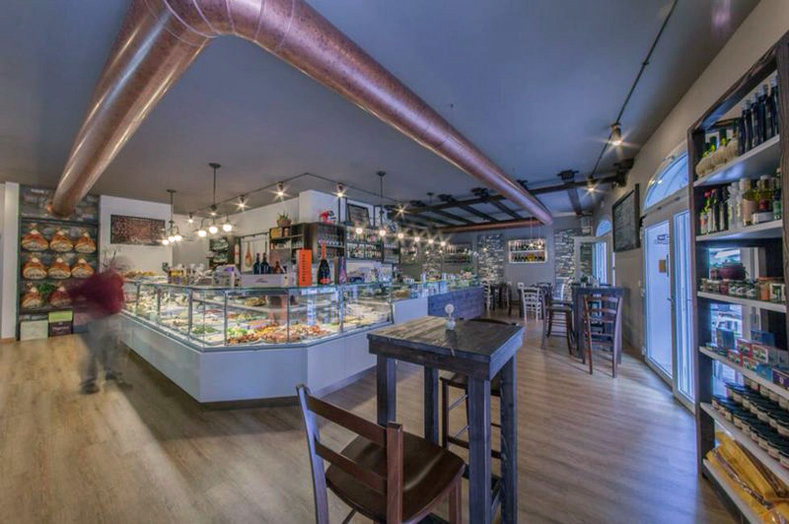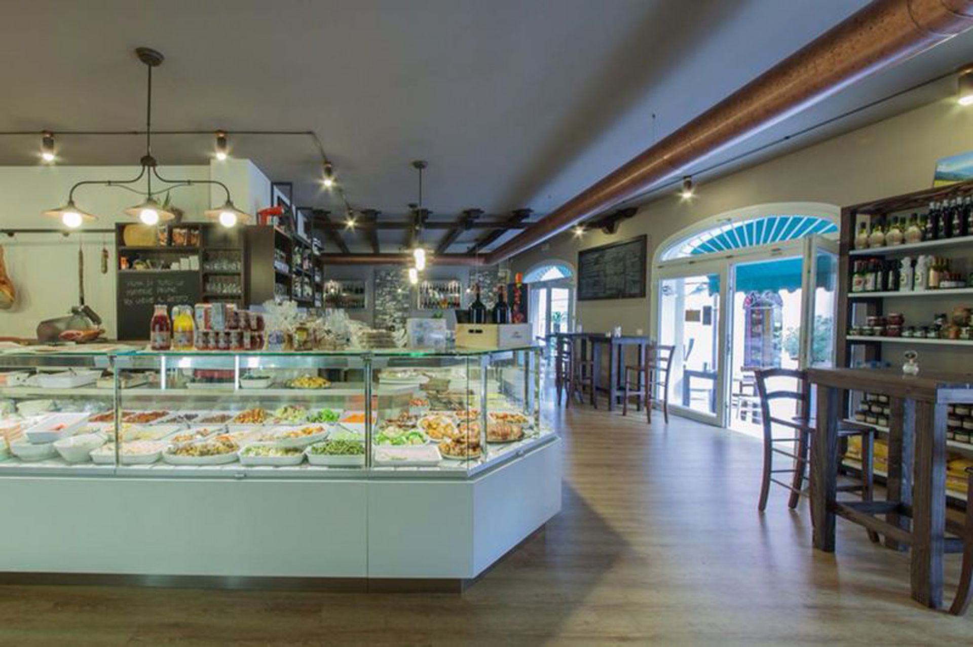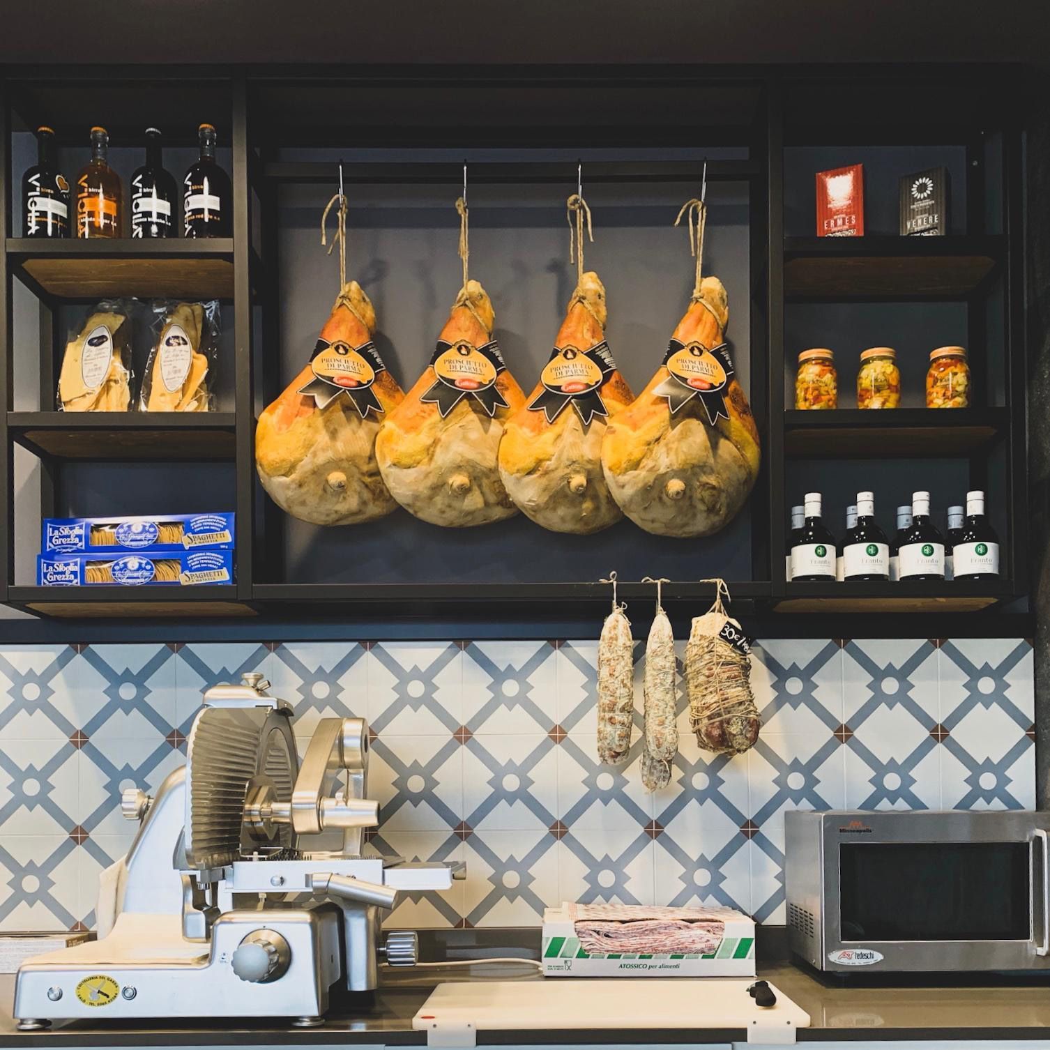 La vetrina refrigerata con vetri curvi richiamo le botteghe di altri tempi, l’angolo preparazione aperitivi, presenta la sua particolarità con le gancere realizzare su misura per appendere i salumi di nicchia proposti.