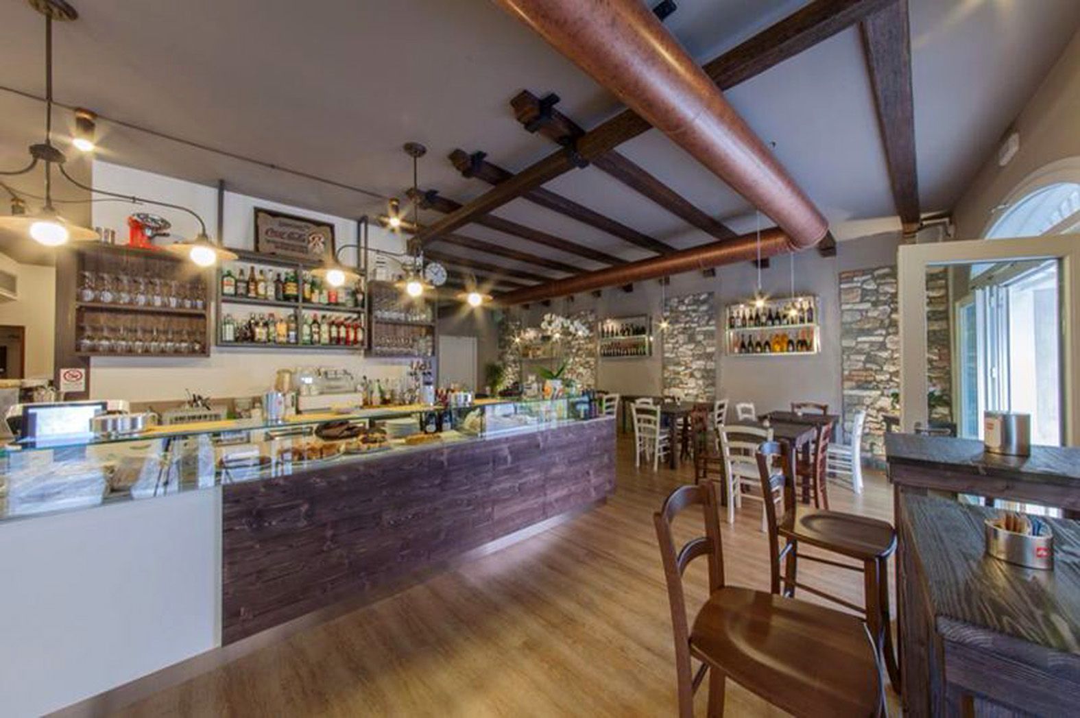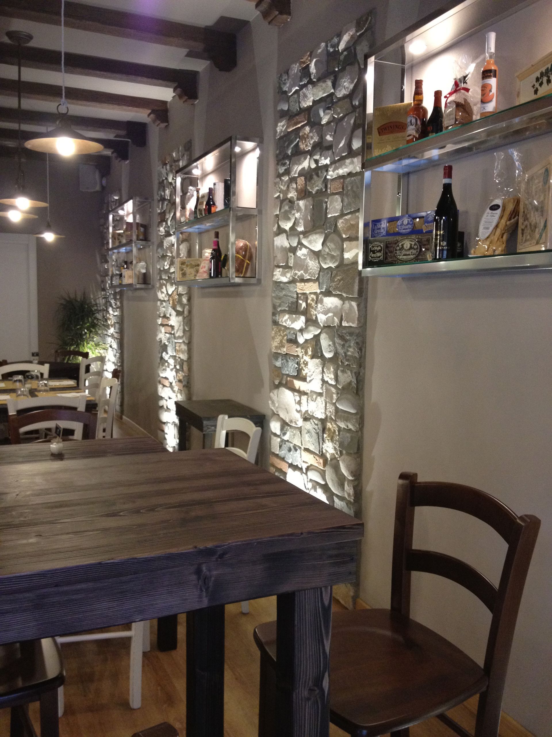 Il locale, complice la vista che il paesaggio lacustre, rappresenta un progetto vincente sotto tutti gli aspetti. Ama arredamenti ha interpretato le parole e il sogno di questi professionisti inserendo nel progetto materiali dal forte richiamo naturale quali il legno, le pietre di fiume, il rame e il ferro crudo. Il progetto d’insieme ha previsto l’utilizzo di un banco refrigerato dall’importante sviluppo dove i prodotti di gastronomia vengono visionati dal cliente in modo eccellente. I pavimenti in parquet, il frontale del banco di mescita con assi di legno e parti chiare, i tavoli con gli sgabelli e sedie verniciati all’anilina, i rivestimenti perimetrali della sala degustazione con pietre di fiume, hanno dato vita ad un luogo dal sapore ricercato. Dalle wine library con un ottima selezione di vini, all’esposizione di prodotti di nicchia nei mobili espositivi da noi realizzati, troviamo sul finire una parete in ferro crudo completamente allestita per l’esposizione di prosciutti rivestita in pietra retroilluminata. Zanoni bottega e cucina è il frutto ben riuscito della splendida collaborazione tra i fratelli Zanoni e di Ama Arredamenti.